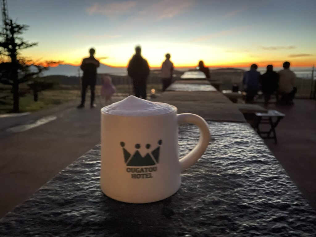 夜明けの30分前からOPENする[日の出カフェ]も雰囲気が素敵。コーヒーやマフィンを販売しています。私はハニーホットミルクを注文。