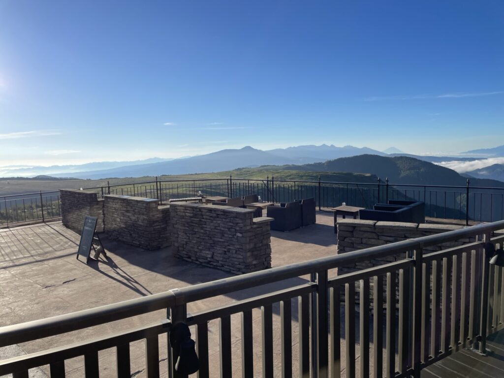 ここは遮るものが全くないので、ぐるっと360° 山の景色が楽しめます。(玄関前からは東側が見えるので日の出を楽めて…ホテルの裏側に回ると 西側なので夕陽を見ることができます。屋上に上るとホントに360°!ぐるっと見渡すことができます)