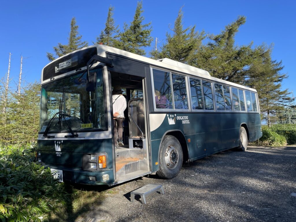 松本駅から無料の送迎バスで行くか、[山本小屋ふる里館]または[美ヶ原自然センター]の駐車場にクルマを置いてバスでホテルに向かいます。なんか…特別な場所に行く感じする!