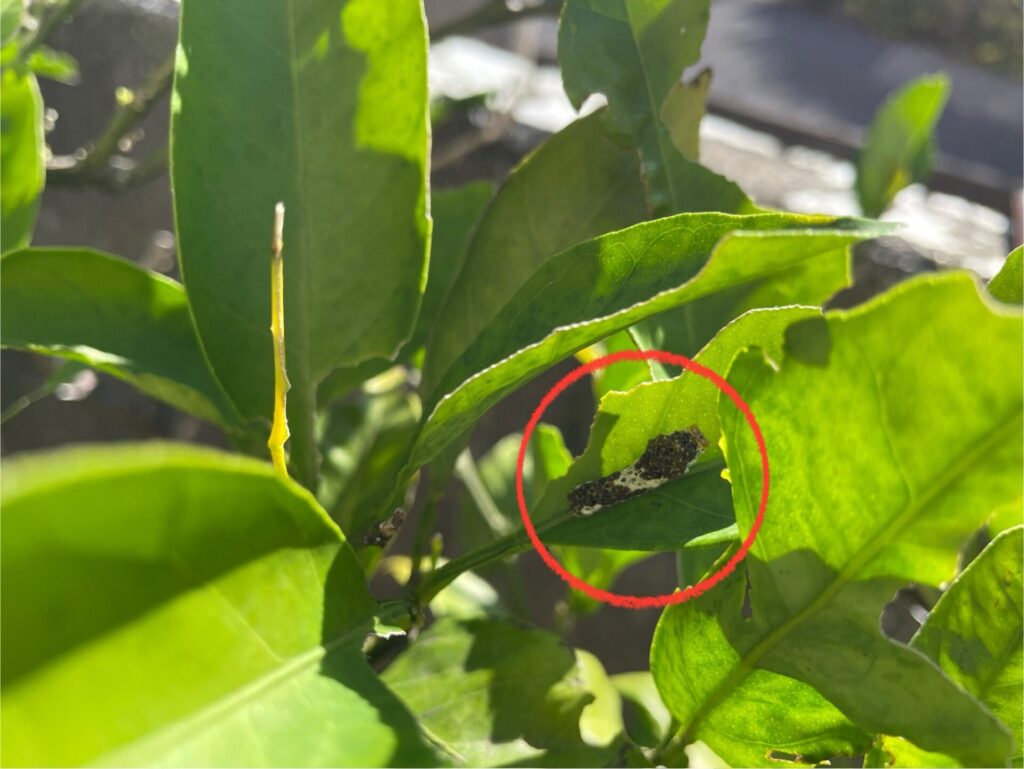 タネから大事に育てているレモン。この子には黒と白が混ざっているのイモムシがいました。