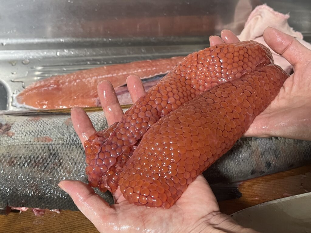 調べてみると、60〜70センチくらいの鮭で2000〜3000個だそうです。(この子は65センチでした)