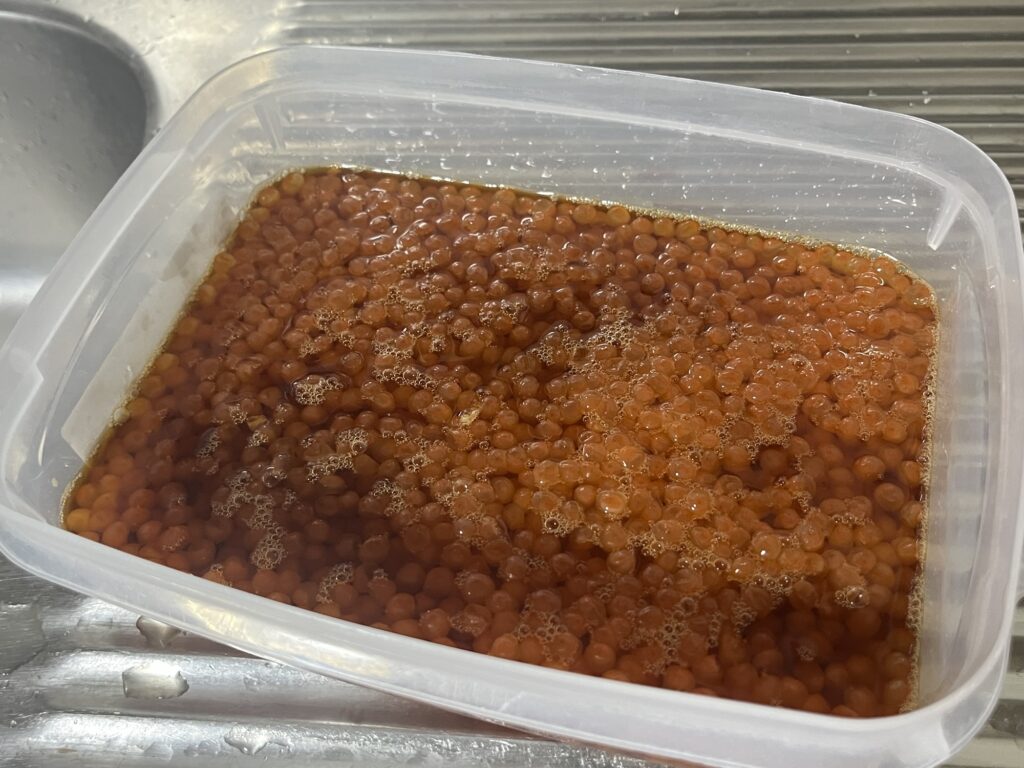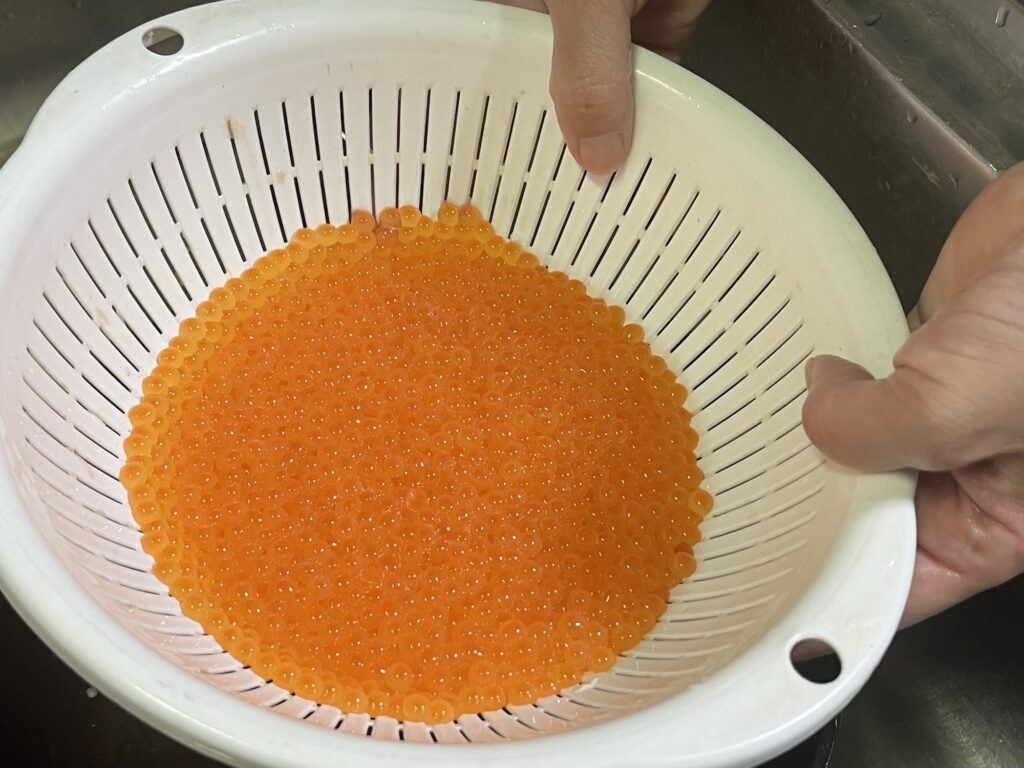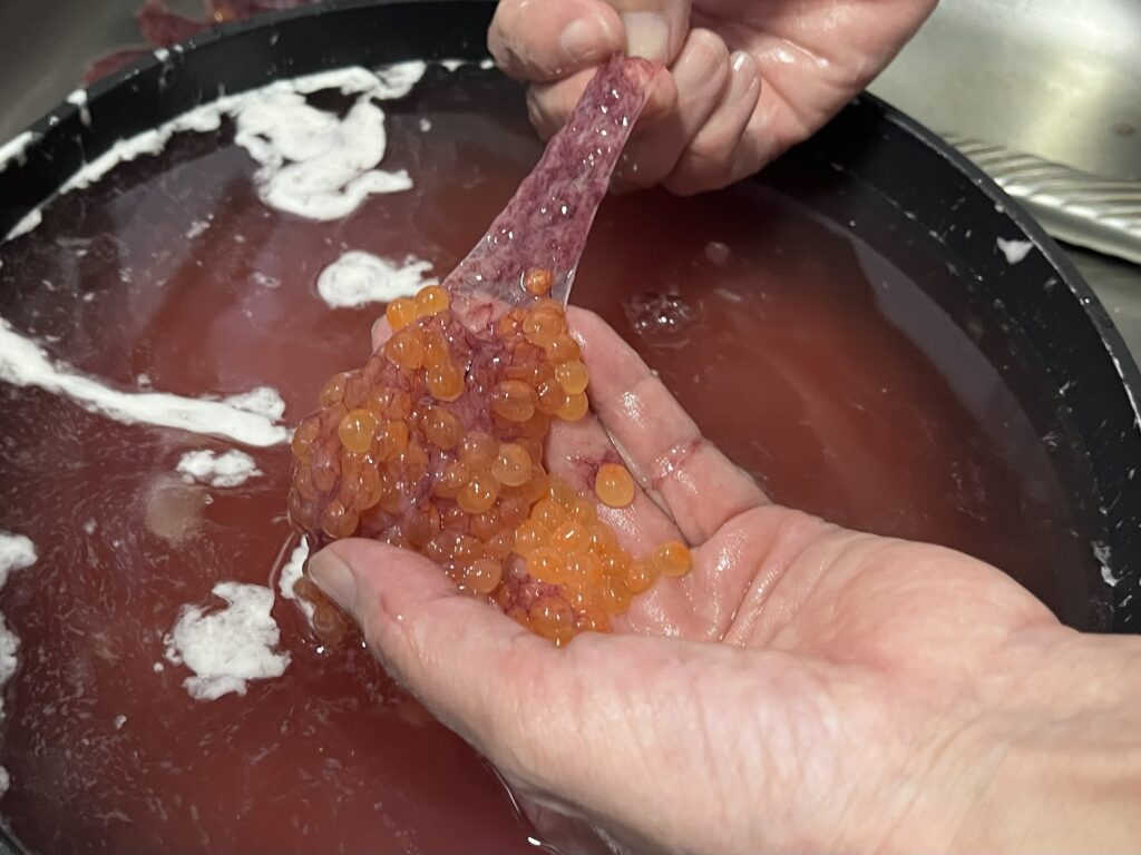 ① 40℃くらいのお湯に塩を入れて、その中に入れて膜から優しくほぐす。薄皮や白い筋を取り除く(塩はお湯1リットルに大さじ2)冷たい水だとギュッとしまってイクラがほぐしにくくなるらしい。