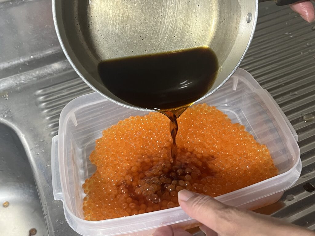 ③ 醤油、みりん、酒を1:1:1で鍋に入れて火にかけアルコールを飛ばす。冷ましたらそこにイクラを入れる。