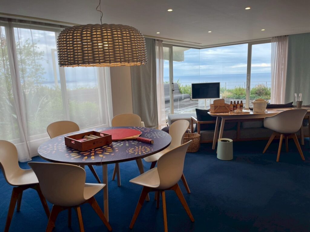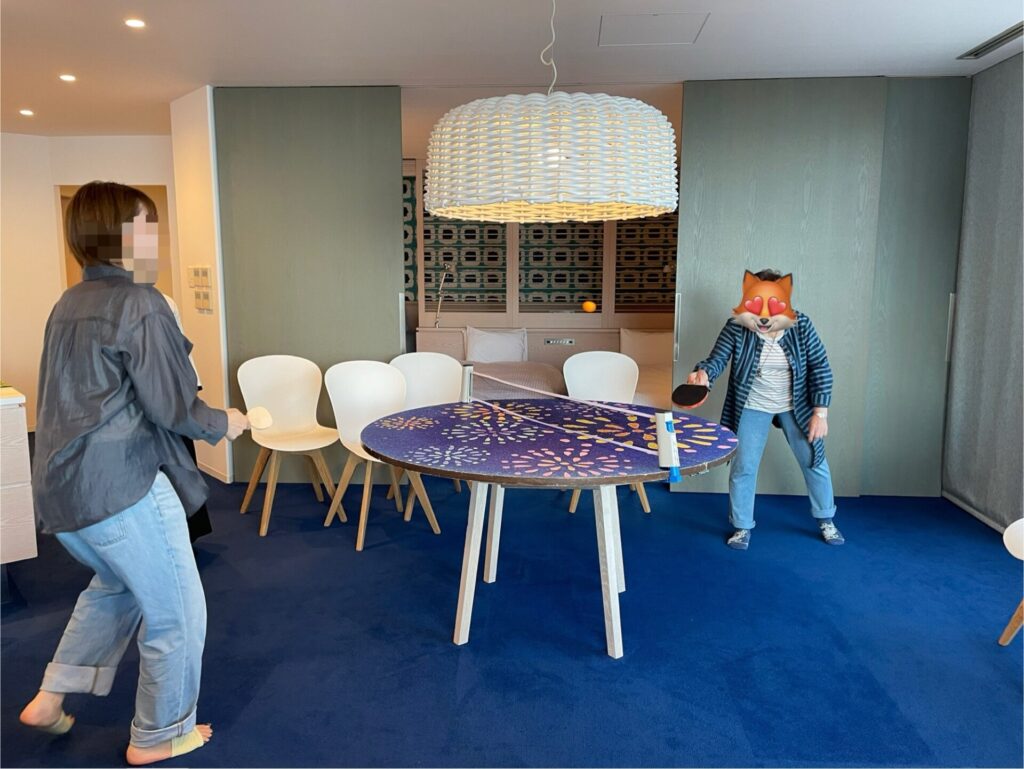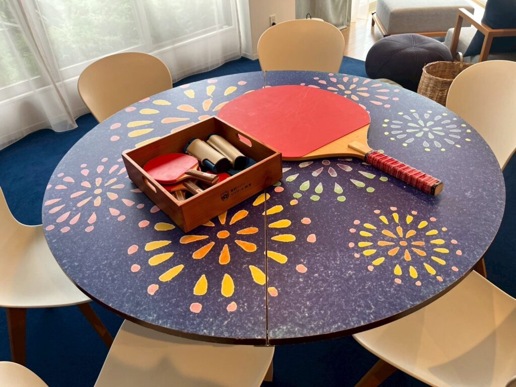 部屋には花火のイラストがある丸いテーブルがあって、そこにネットを張って卓球ができます。こんなのワクワクするに決まってる。これだったら孫たちと来ても絶対に楽しめちゃう。(大人だけなのにけっこう楽しみました)