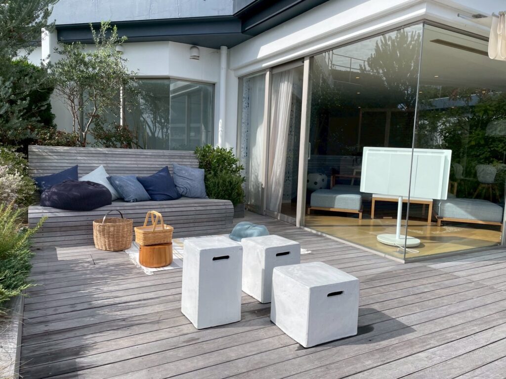 青と白を基調にしたお部屋、広いテラス、広い洗面所、広いトイレ。