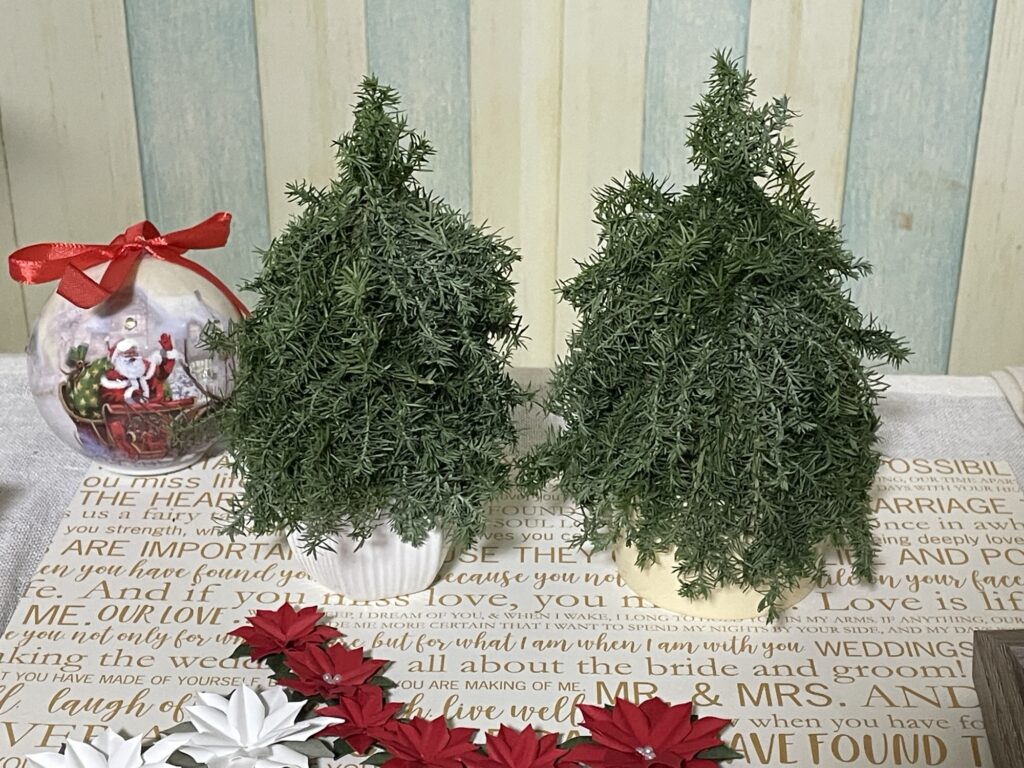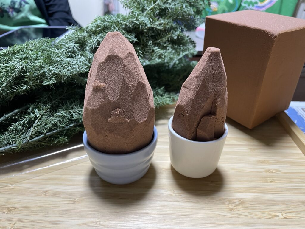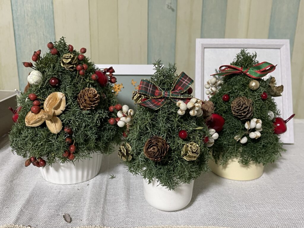 ミニクリスマスツリーは、お花のアレンジをする時に使うオアシスを使いました。最初に買ったのが茶色くてなんか焼き芋みたい(笑)