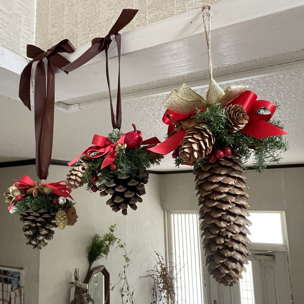 今年初めてなのが、ミニクリスマスツリーと大きな松ぼっくりで作ったオーナメントです。