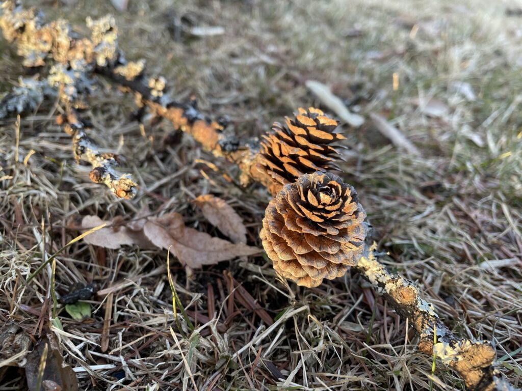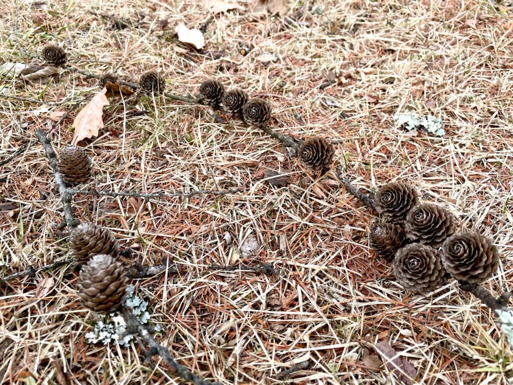 今まで、《どこに行ったらあるんだろう》とダイソーで買っていたカラマツの実を拾える機会が訪れるなんて、本当に夢のよう。