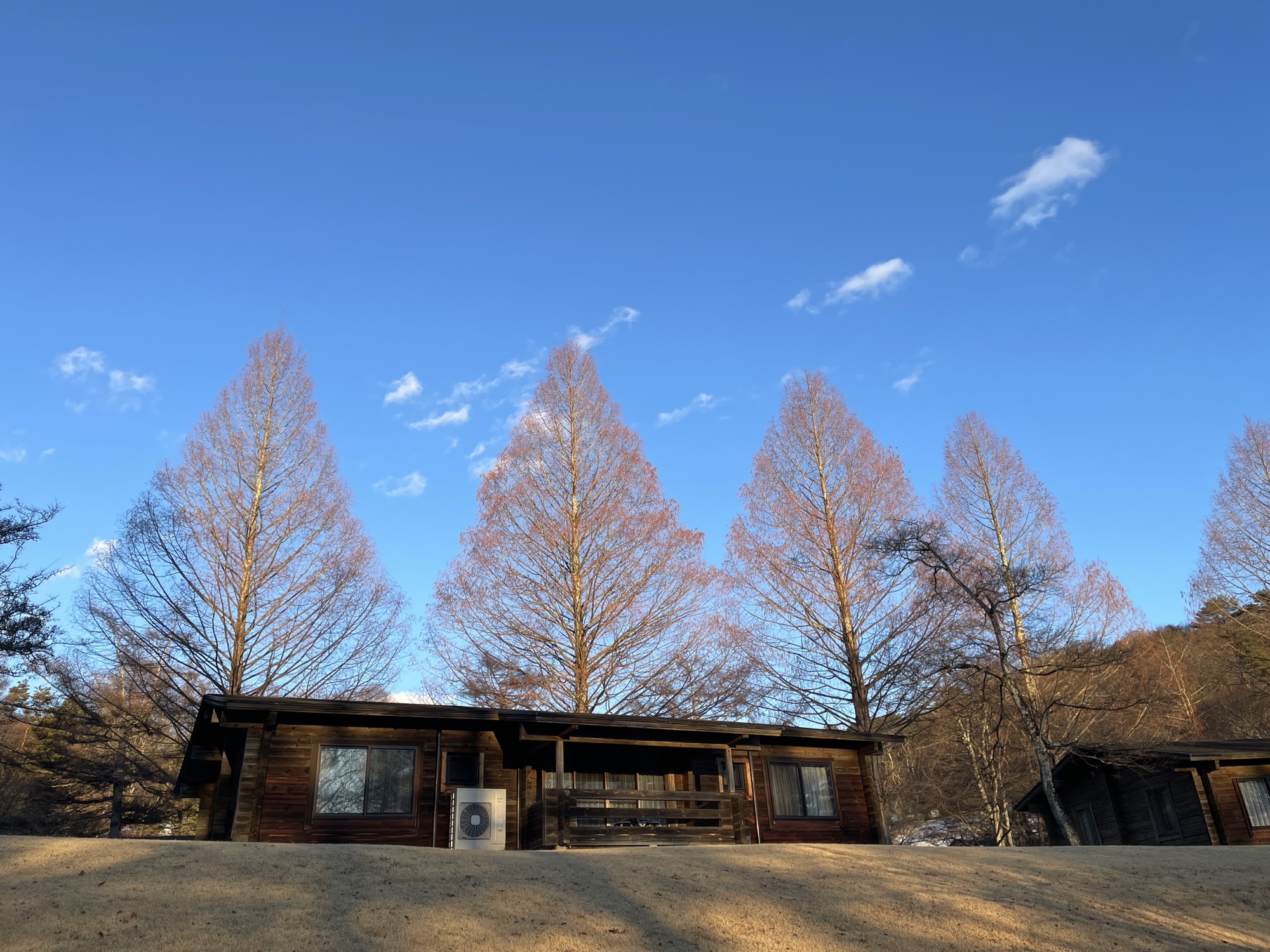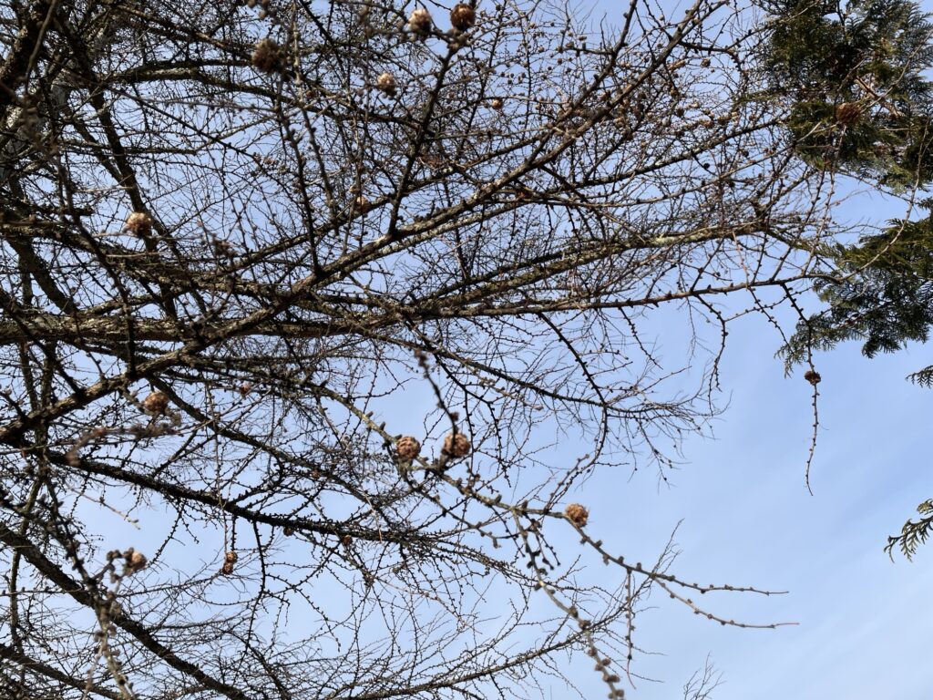 ところが。。。その後落ち着いてよ〜く見ると、この敷地はカラマツがたくさん。隣にあるモミの木は青々しているのに、カラマツは《枯れちゃったの?》みたいな見た目。葉っぱが全く無い木に、カラマツの実が鈴なりになっています。《これはすごい。こんなにたくさん実がなるのね。》とほどほどに拾い…自分の宿泊しているコテージに戻り窓から外を見ると、裏側にめっちゃ落ちてる(笑)