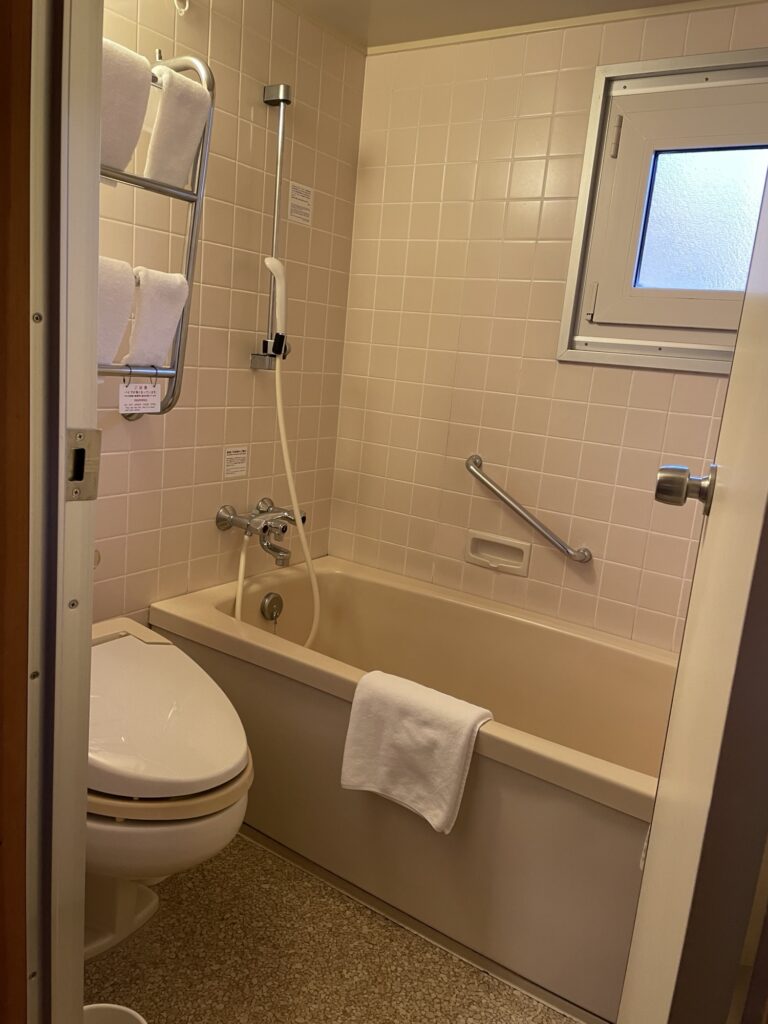 各部屋にはベッドが2つ、バストイレが付いています。(バストイレは一緒、洗面台は別です)(有料だけれども大浴場もあります)