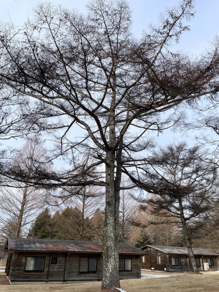 チェックイン後に部屋の周辺を散策していたら、カラマツの実を発見!地元千葉ではなかなか拾えない実なので《大変!拾っていかなきゃ!》とワクワク。