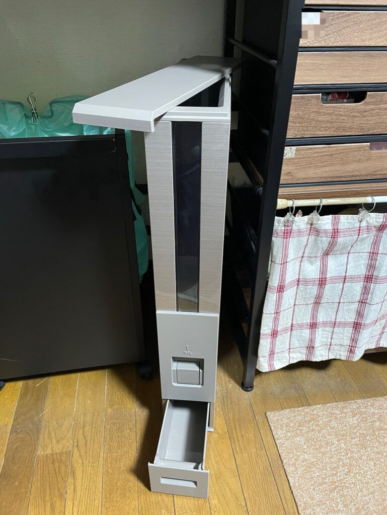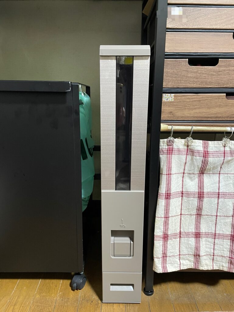 今どきの米びつがこんなにスリムだったとは。幅がたったの10センチ!(奥行きは40センチ、高さは62センチ)それなのに12キロもお米入ります。