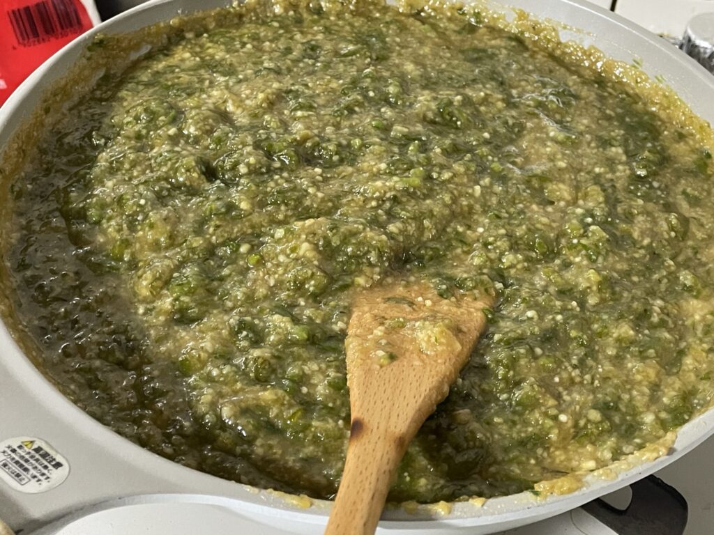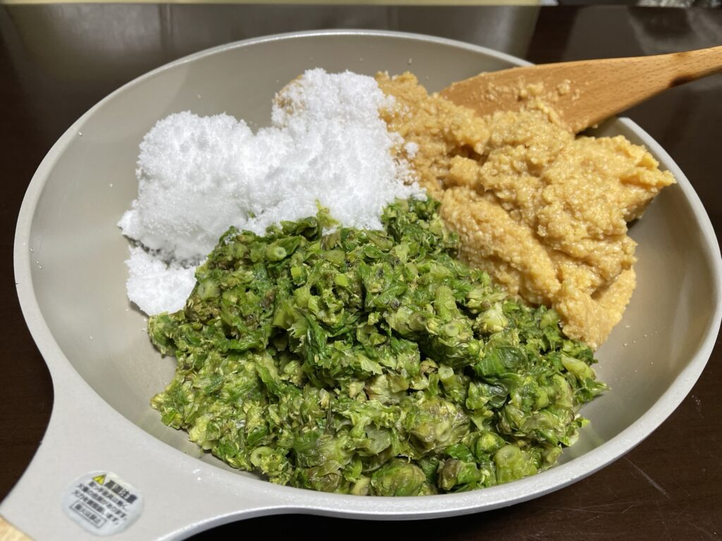 水分を絞ったふきのとうと 味噌と 砂糖を入れて火にかける。