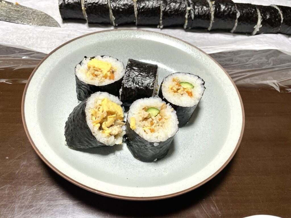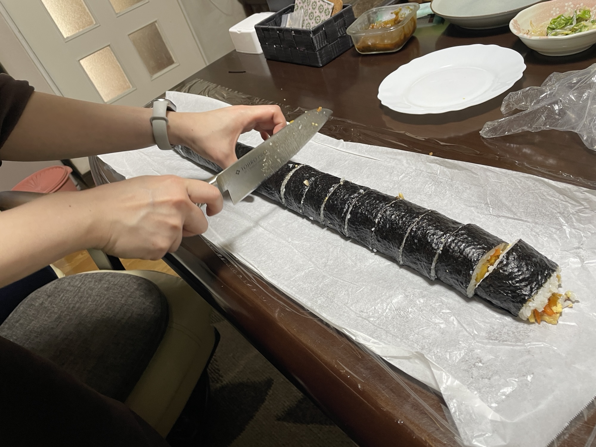 子供たちが横に並んで みんなで[長い太巻き寿司]を作る予定があるそうで、分量を確認するために、「家にしてはちょっと長い太巻き寿司を作る」と言うので、子供の手になり変わってお手伝いしました。