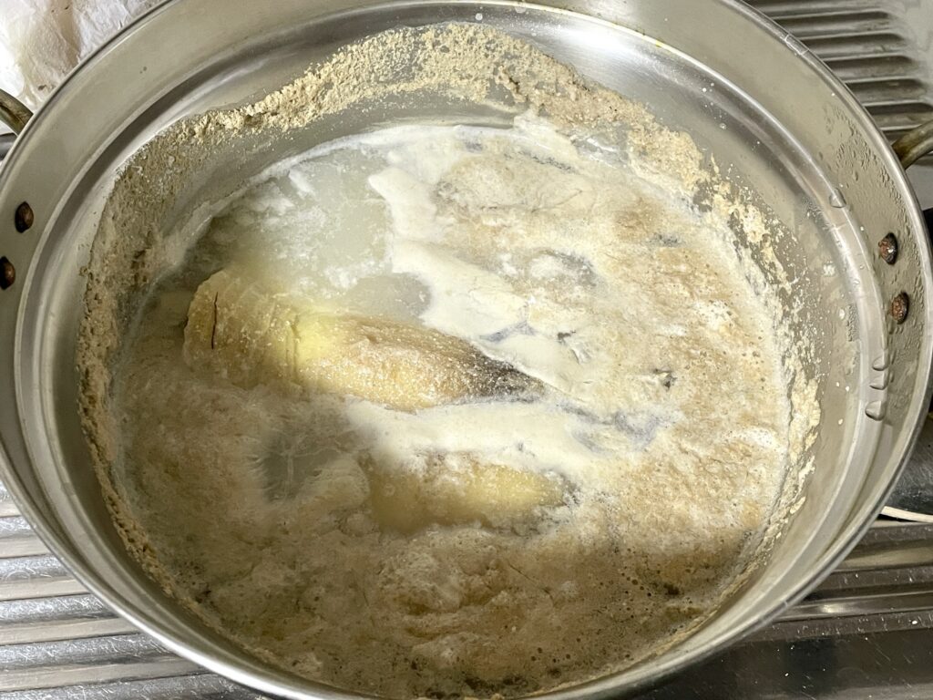 皮をむいて、ヌカを入れてコトコト茹でて……と、ここからは私の仕事になってしまいます。